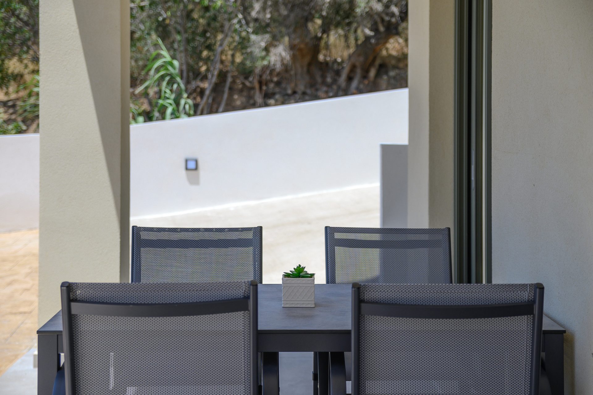 Step outside to enjoy the villa’s exterior amenities. A private swimming pool invites you to cool off on warm Cretan days, while the fenced garden provides a safe and serene environment. The terrace with the loungers, the umbrellas and the garden furniture offer perfect spots for alfresco dining or simply soaking in the Mediterranean sun. For outdoor cooking enthusiasts, a barbecue is available for preparing delicious meals under the open sky.
